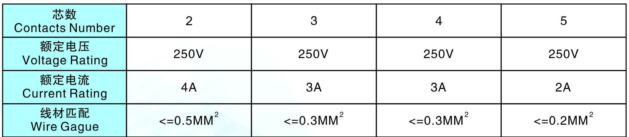 線材匹配(Wire  Gague):<=0.5MM2       <=0.3MM2       <=0.3MM2      <=0.2MM2