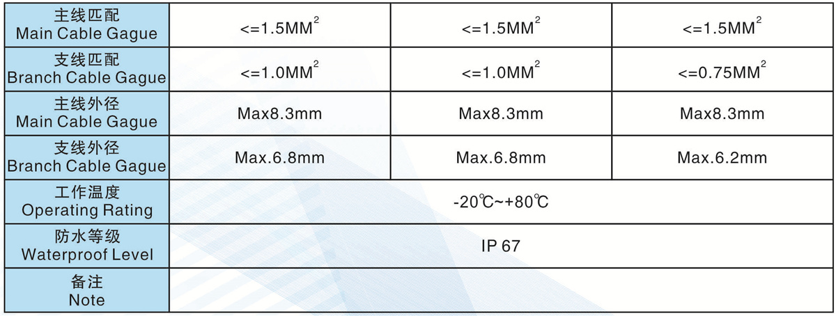 主線匹配(Main Cable Gague): <= 1.5MM2 <=1.5MM2 <=1.5MM2